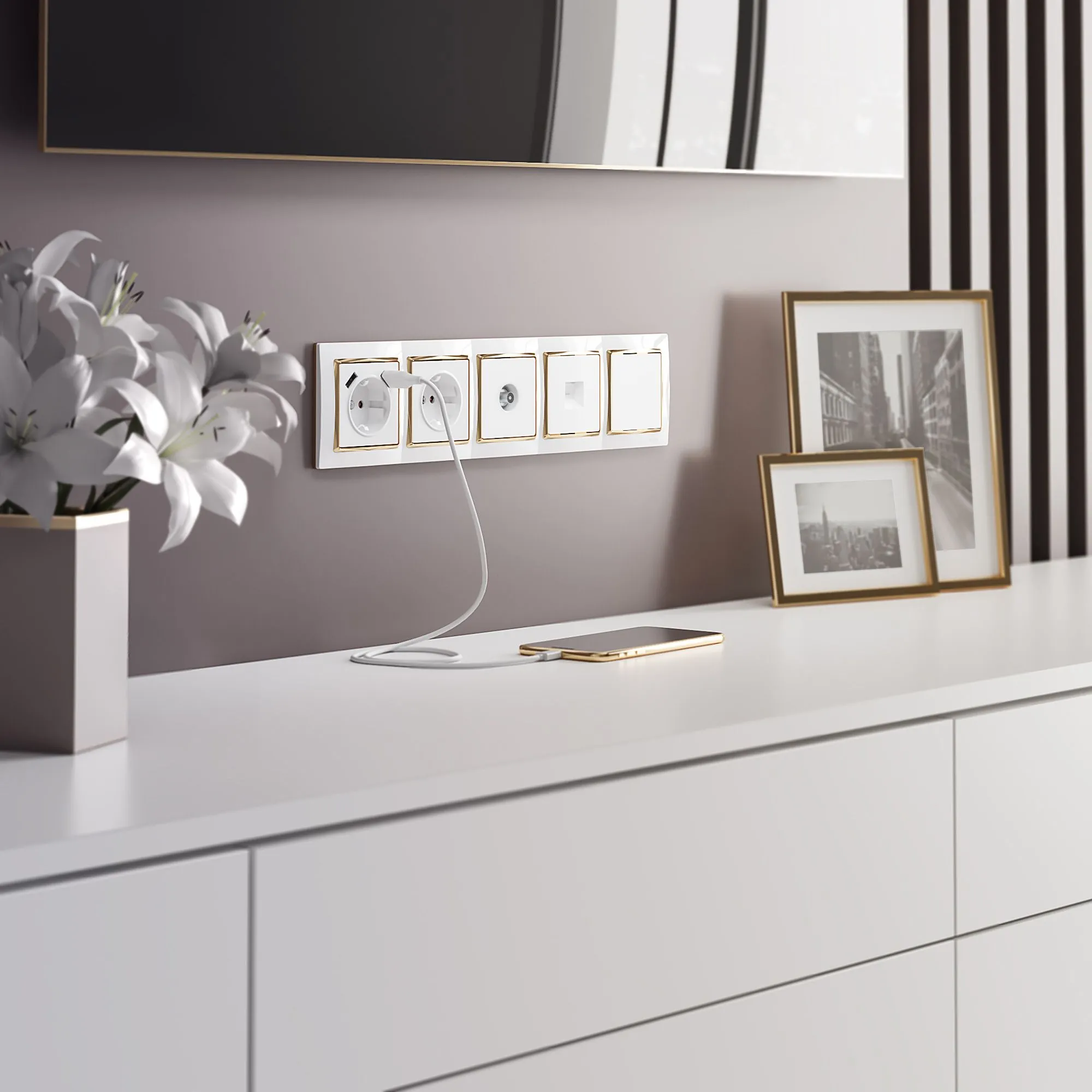 Лаконичная белая глянцевая лицевая панель гармонично сочетается с любыми отделочными материалами. Розетка полностью совместима со всеми рамками Werkel, что позволяет создавать индивидуальные композиции в едином стиле — от минимализма до премиум-дизайна.